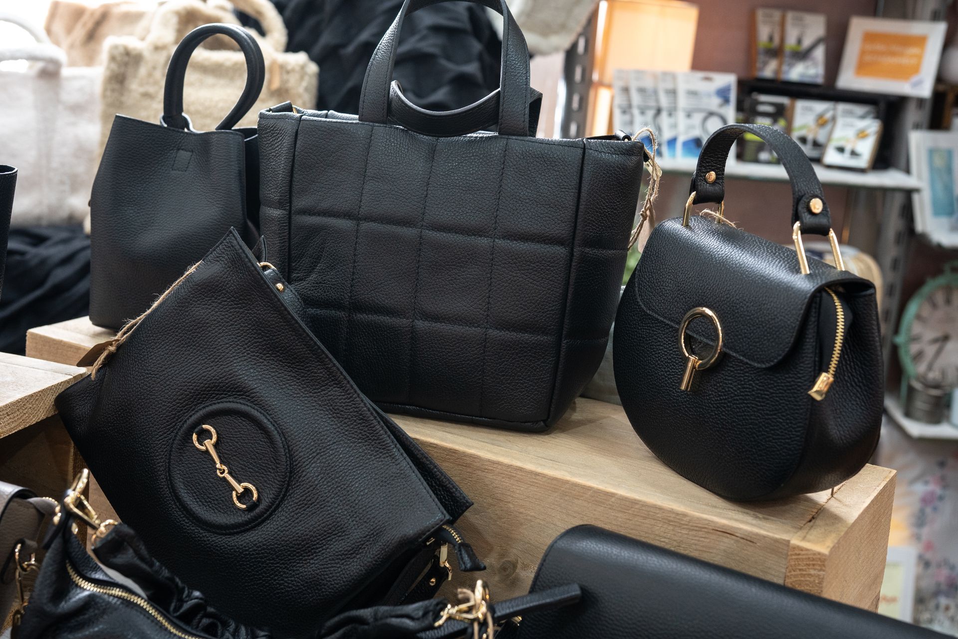 Dann sind Sie am Ladeneingang gleich richtig bei uns angekommen. Taschen, Geldbörsen, Gürtel, Tücher, Accessoires, ausgesuchter Modeschmuck... alles, was Frau liebt.